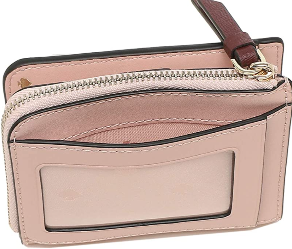 2つ折りタイプの財布で、お札を入れる所が2か所あります。左のポケットが小銭入れで、結構入ります。小銭入れはボタンで閉めます。入れすぎるとパンパンになって、外側のチャックが閉めにくいです。